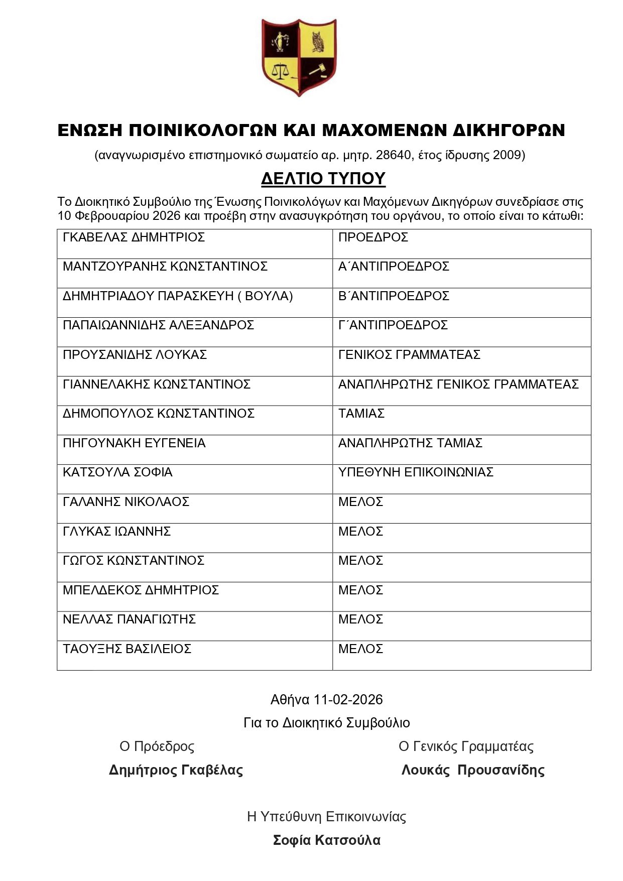 Η Ένωση Ποινικολόγων και Μαχόμενων Δικηγόρων προχώρησε, κατόπιν συνεδρίασης του Διοικητικού Συμβουλίου στις 10 Φεβρουαρίου 2026, στην ανασυγκρότηση του οργάνου